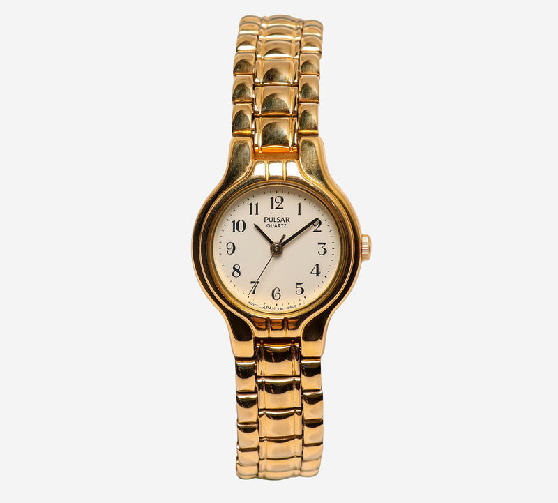 This pre-owned Pulsar watch is in Good condition featuring Quartz Analog movement, with a Gold case and a Gold Metal 5 inch band. 20mm
