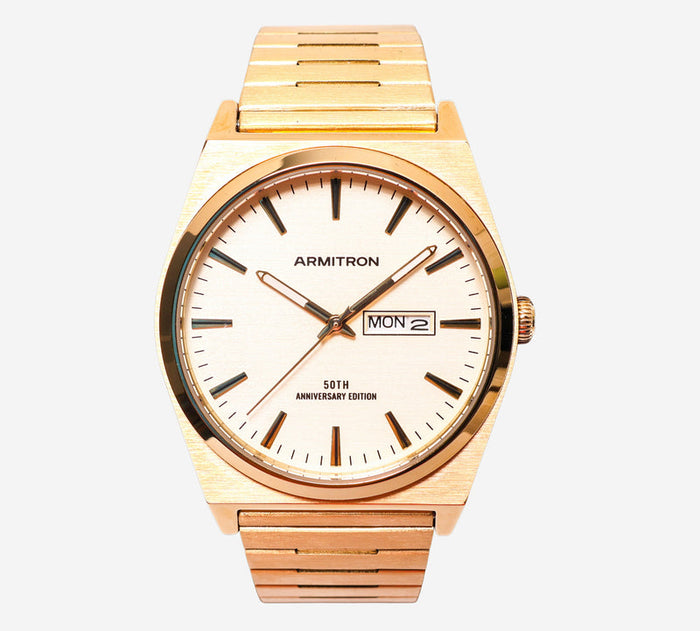 This pre-owned Armitron watch is in Excellent condition featuring Quartz Analog movement, with a Gold case and a Gold Leather 7 inch band. 40mm