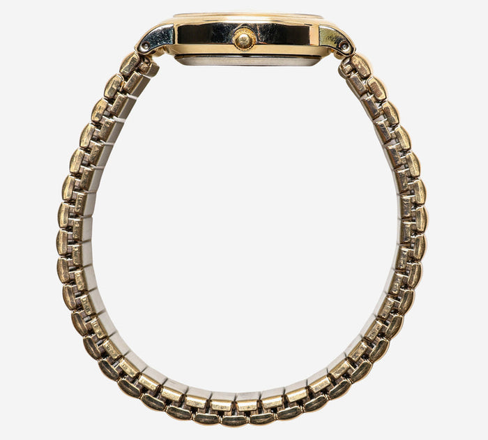 This pre-owned Timex watch is in Excellent condition featuring Quartz Analog movement, with a Gold case and a Gold Metal 7 inch band. Own a piece of watchmaking history and give this watch a second life. All watch movements and batteries have been tested and operate as intended. No battery included for D5quartz watches. We cannot guarantee water resistance ratings are intact.