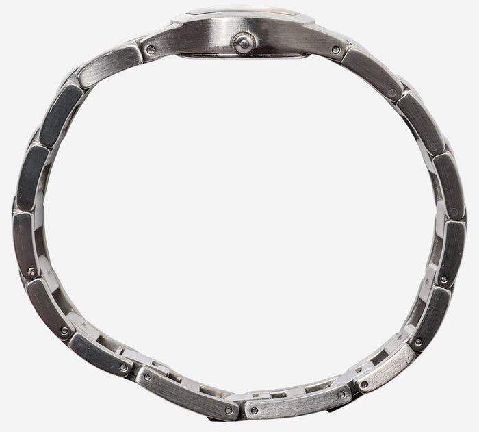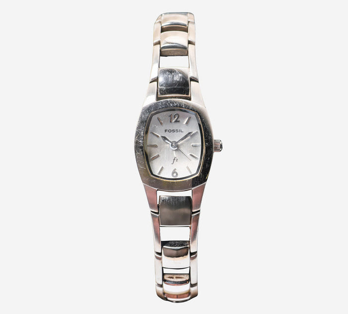 This pre-owned Fossil watch is in Good condition featuring Quartz Analog movement, with a Silver case and a Silver Metal 6 inch band.