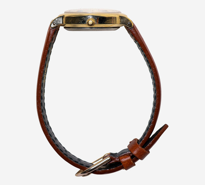 This pre-owned Timex watch is in Excellent condition featuring Quartz Analog movement, with a Gold case and a Brown Leather 7 inch band. Own a piece of watchmaking history and give this watch a second life. All watch movements and batteries have been tested and operate as intended. No battery included for D5quartz watches. We cannot guarantee water resistance ratings are intact.