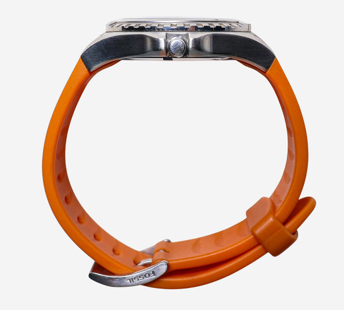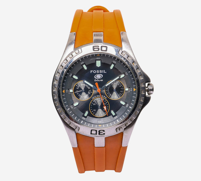 This pre-owned Fossil watch is in Good condition featuring Quartz Analog movement, with a Silver case and a Orange Resin 7 inch band. Own a piece of watchmaking history and give this watch a second life. All watch movements and batteries have been tested and operate as intended. No battery included for D5quartz watches. We cannot guarantee water resistance ratings are intact.