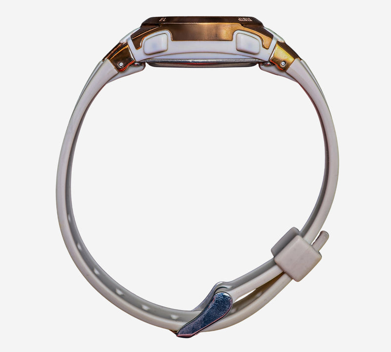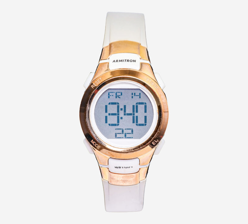 This pre-owned Armitron watch is in Good condition featuring Quartz Digital movement, with a Gold case and a Cream Resin 7 inch band. 25mm