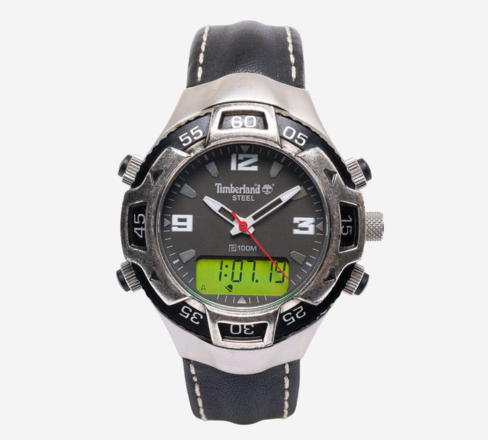 This pre-owned Timberland watch is in Good condition featuring Quartz Analog &Quartz Digital movement, with a Silver case and a Black Metal 7 inch band. 40mm