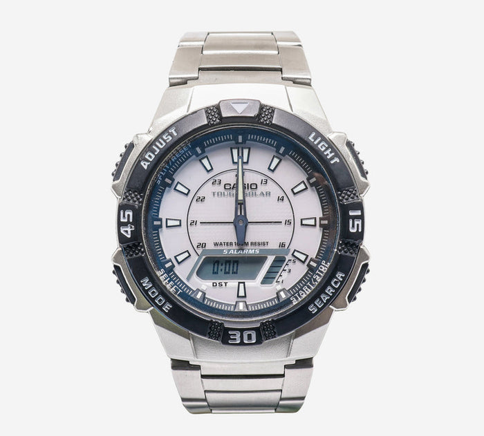 This pre-owned Casio watch is in Good condition featuring Quartz Analog movement, with a Black case and a Silver Metal 7 inch band 40mm