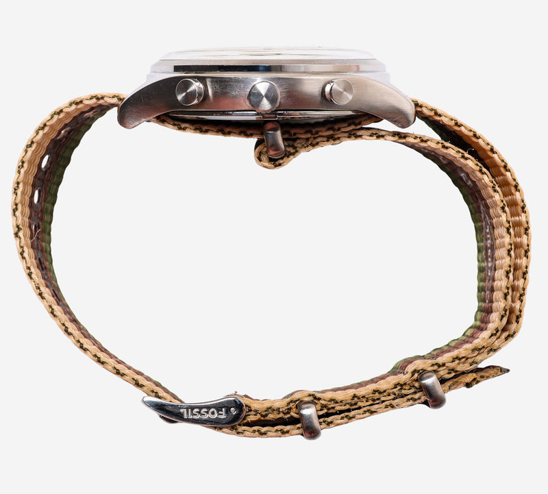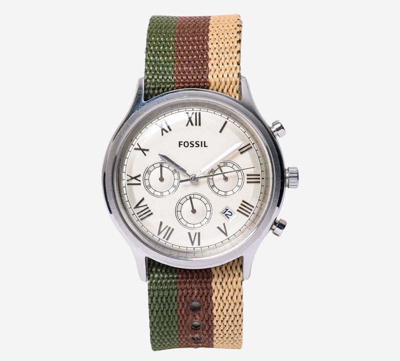 This pre-owned Fossil watch is in Excellent condition featuring Quartz Analog movement, with a Silver case and a Green and Brown Fabric 7 inch band.