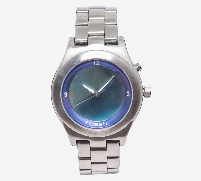 This pre-owned Fossil watch is in Good condition featuring Quartz Analog movement, with a Silver case and a Silver Metal 7 inch band 35mm