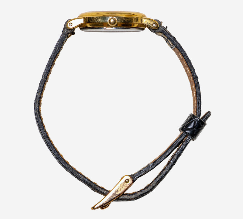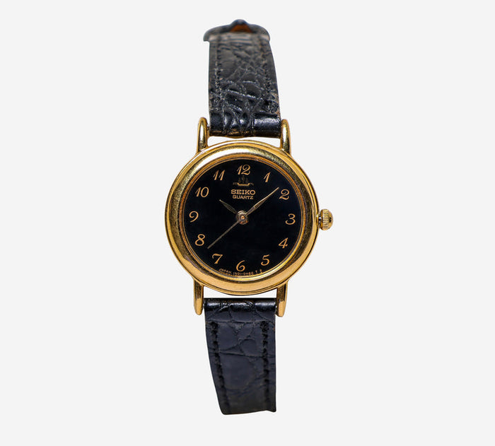This pre-owned Seiko watch is in Good condition featuring Quartz Analog movement, with a Gold case and a Black Leather 6.5 inch band. Own a piece of watchmaking history and give this watch a second life. All watch movements and batteries have been tested and operate as intended. No battery included for D5quartz watches. We cannot guarantee water resistance ratings are intact.