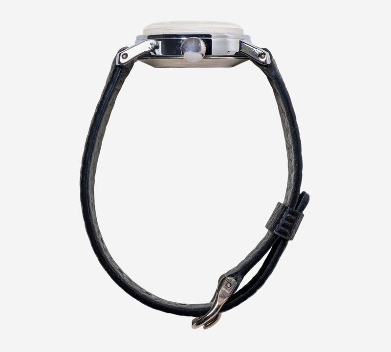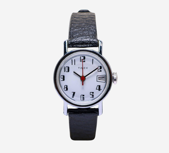 This pre-owned Timex watch is in Excellent condition featuring Quartz Analog movement, with a Silver case and a Black Leather 6.5 inch band. Own a piece of watchmaking history and give this watch a second life. All watch movements and batteries have been tested and operate as intended. No battery included for D5quartz watches. We cannot guarantee water resistance ratings are intact.