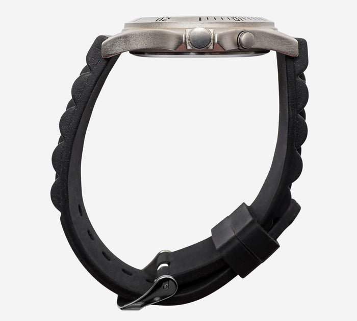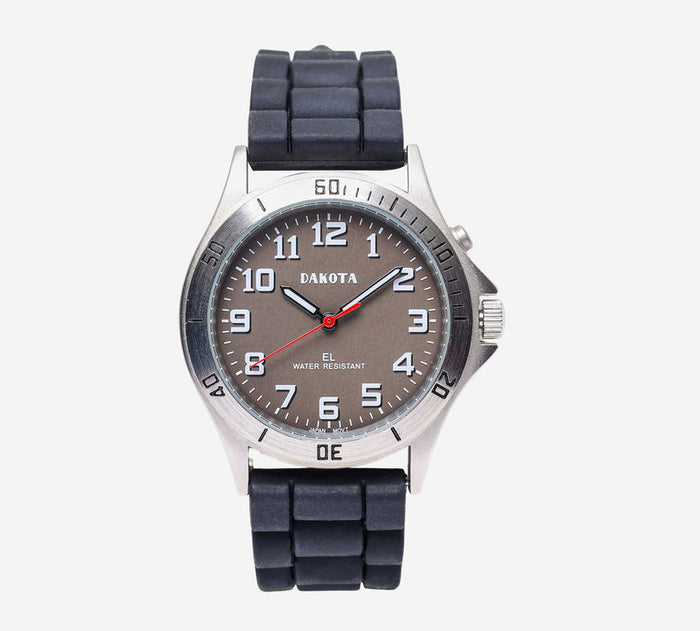 This pre-owned Dakota watch is in Excellent condition featuring Quartz Analog movement, with a Silver case and a Black Resin 7 inch band. 40mm