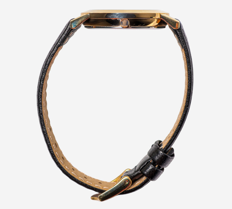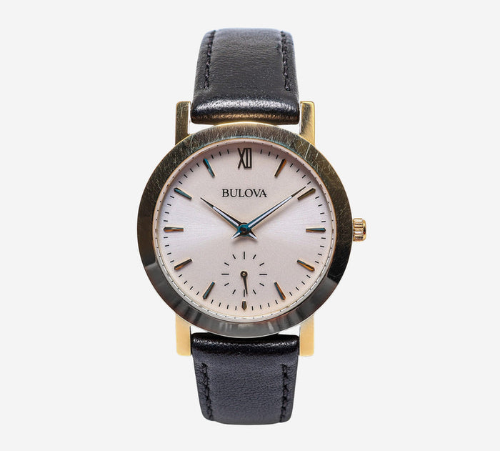 This pre-owned Bulova watch is in Good condition featuring Quartz Analog movement, with a Gold case and a Black Leather 6.5 inch band. 30mm