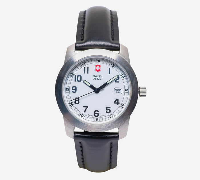 This pre-owned Swiss Army watch is in Excellent condition featuring Quartz Analog movement, with a Silver case and a Black Leather 7 inch band. 30mm
