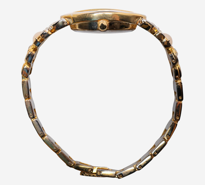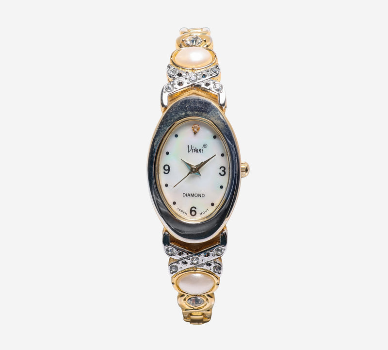 This pre-owned Vivan watch is in Excellent condition featuring Quartz Analog movement, with a Gold case and a Gold Metal 5.5 inch band. 20mm