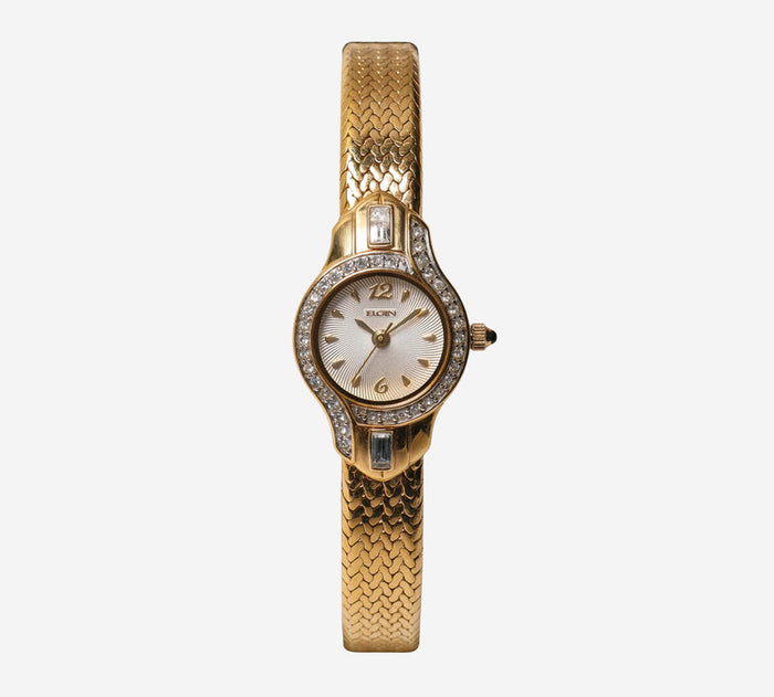 This pre-owned Elgin watch is in Excellent condition featuring Quartz Analog movement, with a Gold case and a Gold Metal 6 inch band. 20mm