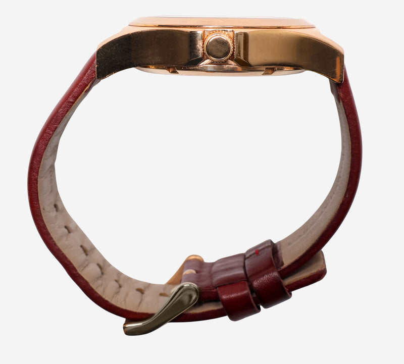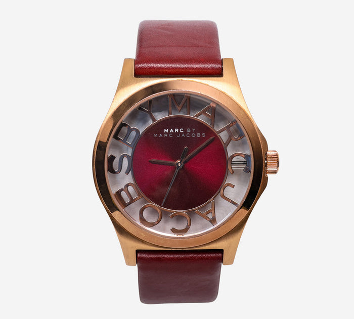 This pre-owned Marc watch is in Good condition featuring Quartz Analog movement, with a Gold case and a Red Metal 7 inch band. 40mm