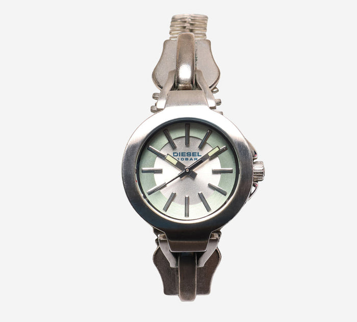 This pre-owned Diesel watch is in Good condition featuring Quartz Analog movement, with a Silver case and a White Metal 7 inch band. 25mm