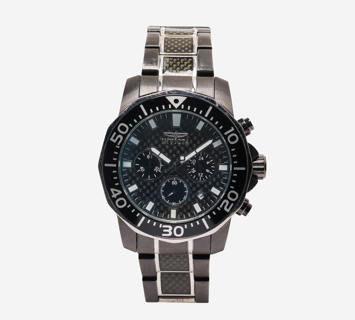 This pre-owned Invicta watch is in Good condition featuring Quartz Analog movement, with a Black case and a Black Leather 7 inch band. 45mm