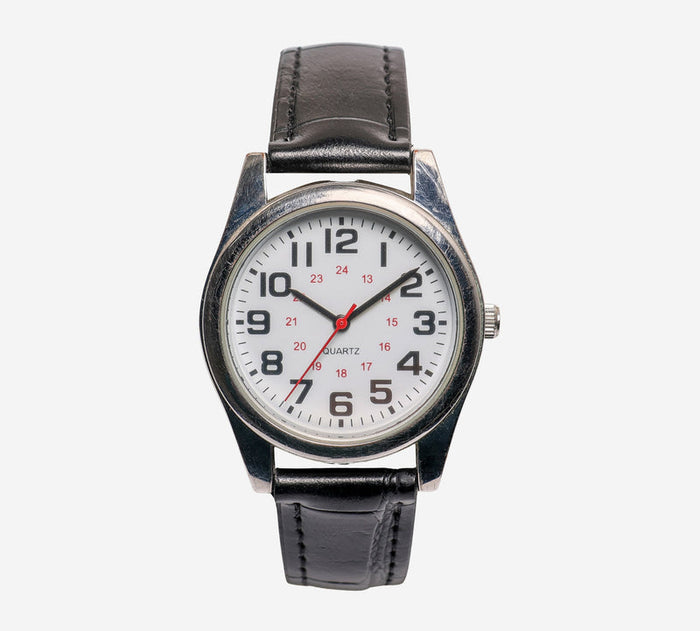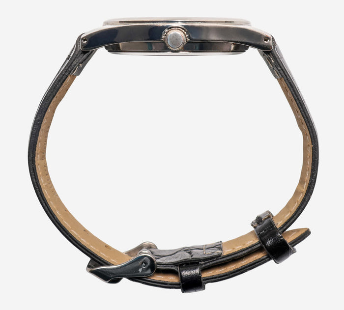 This pre-owned Accutime watch is in Excellent condition featuring Quartz Analog movement, with a Silver case and a Black Leather 7 inch band. 35mm