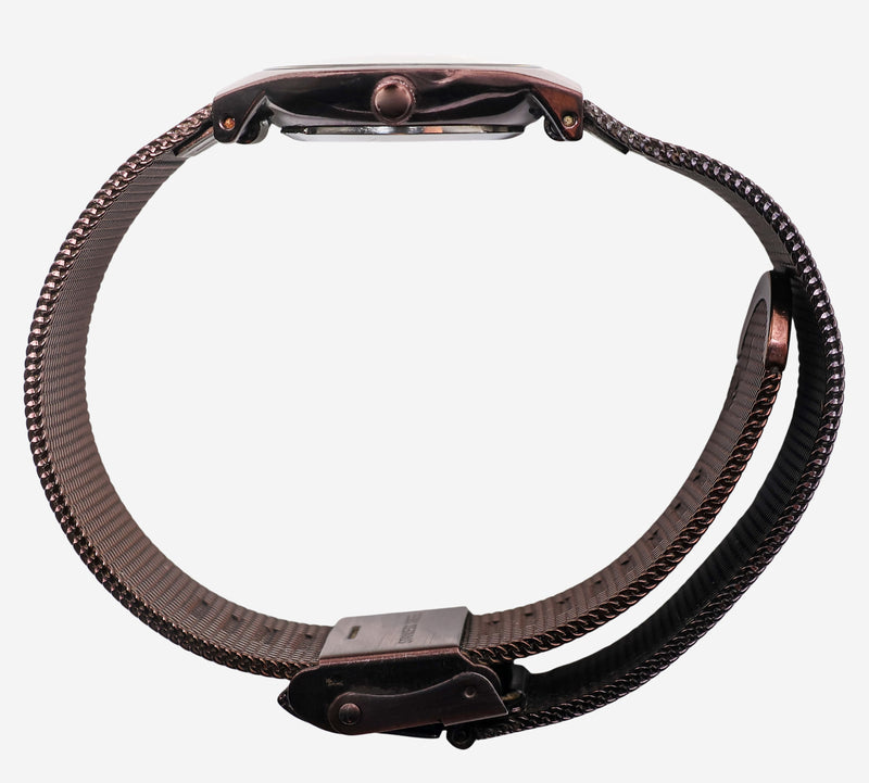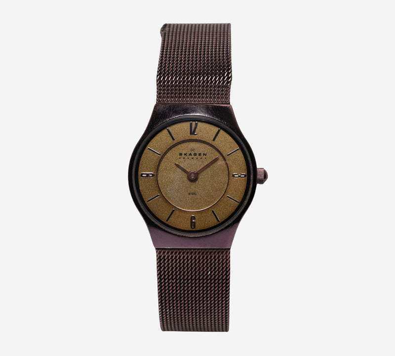 This pre-owned Skagen watch is in Good condition featuring Quartz Analog movement, with a Gold case and a Brown Metal 7 inch band. 25mm