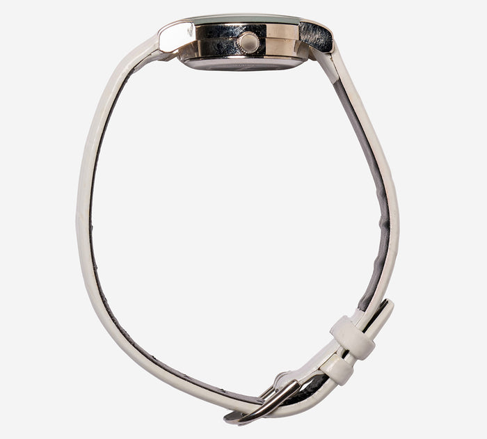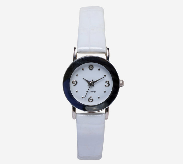 This pre-owned Diamond watch is in Excellent condition featuring Quartz Analog movement, with a Silver Case and a White Leather band. Own a piece of watchmaking history and give this watch a second life. All watch movements and batteries have been tested and operate as intended. No battery included for D5quartz watches. We cannot guarantee water resistance ratings are intact.