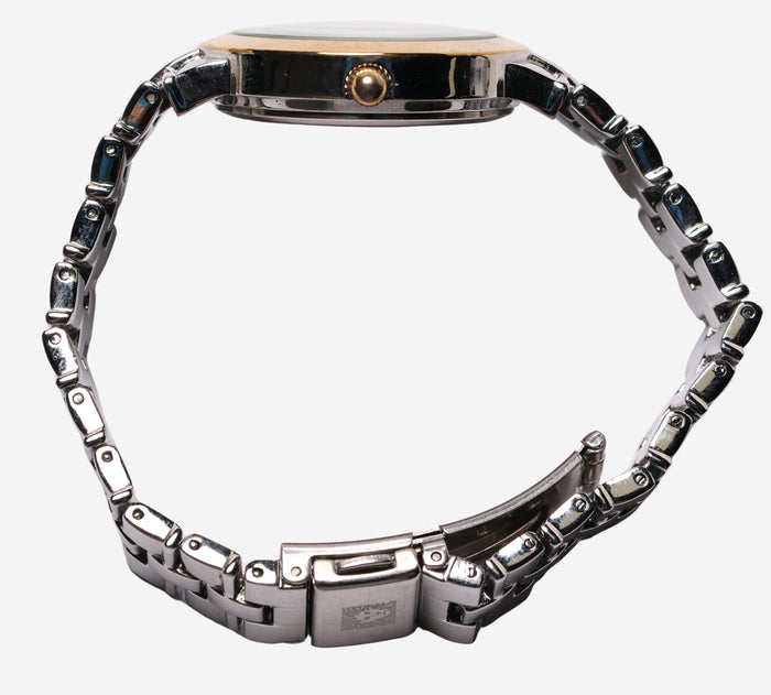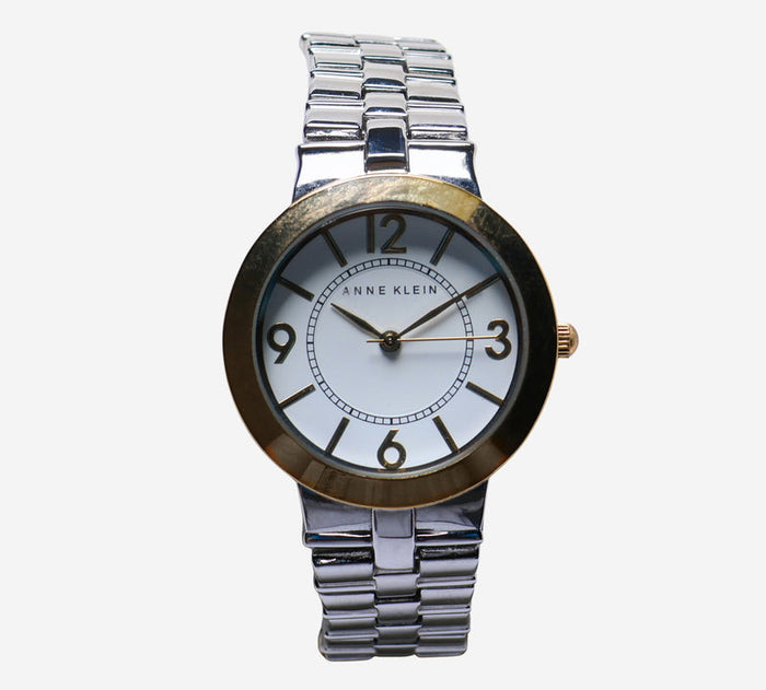 This pre-owned Anne Klein watch is in Excellent condition featuring Quartz Analog movement, a Gold Case and a Silver Metal band.