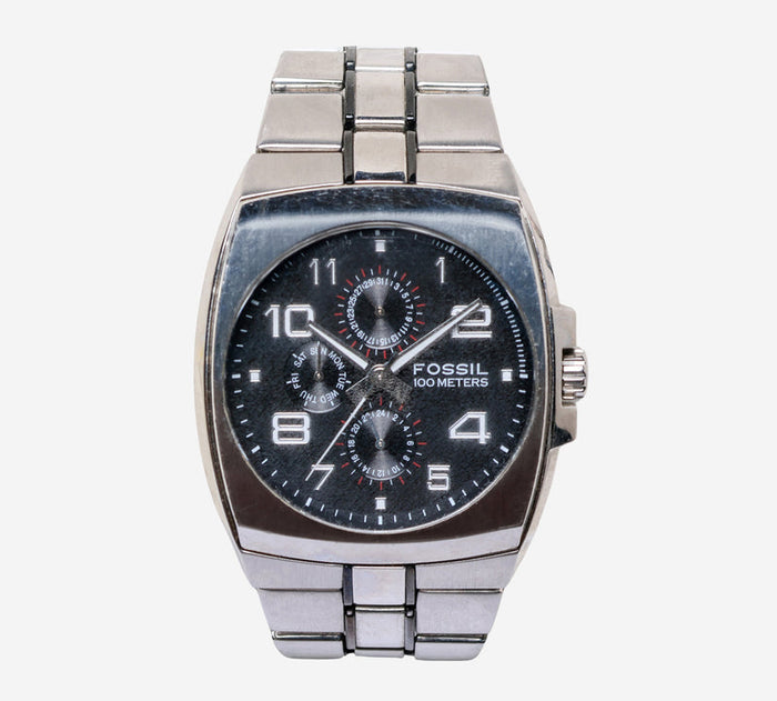 This pre-owned Fossil watch is in Excellent condition featuring Quartz Analog movement, with a Silver Case and a Silver Metal band.