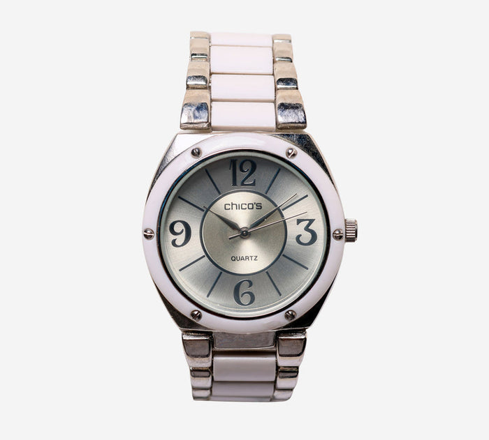 This pre-owned Chico's watch is in Excellent condition featuring Quartz Analog movement, with a White Case and a White & Silver Metal band.
