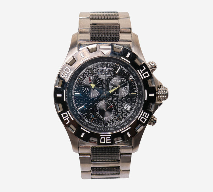 This pre-owned Invicta watch is in Excellent condition featuring Quartz Analog movement, with a Black Case and a Silver Metal band. Own a piece of watchmaking history and give this watch a second life. All watch movements and batteries have been tested and operate as intended. No battery included for D5quartz watches. We cannot guarantee water resistance ratings are intact.