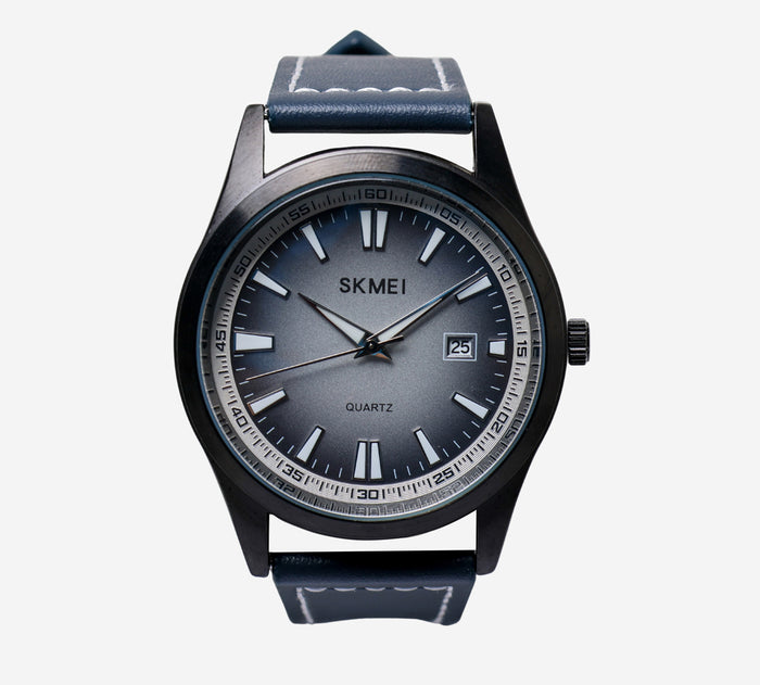 This pre-owned Skmei watch is in Excellent condition featuring Quartz Analog movement, with a Black Case and a Gray Leather band.