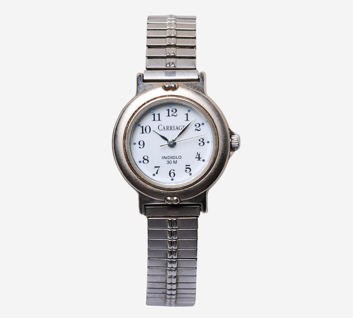 This pre-owned Carriage watch is in Good condition featuring an Quartz Analog movement, with a Silver Case and a Silver Metal band.