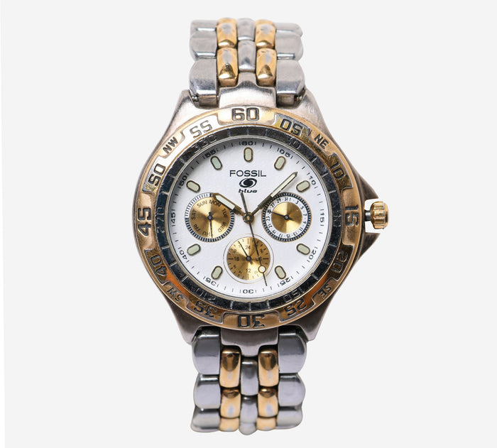 This pre-owned Fossil watch is in Excellent condition featuring Quartz Analog movement, with a Gold Case and a Gold & Silver Metal band.