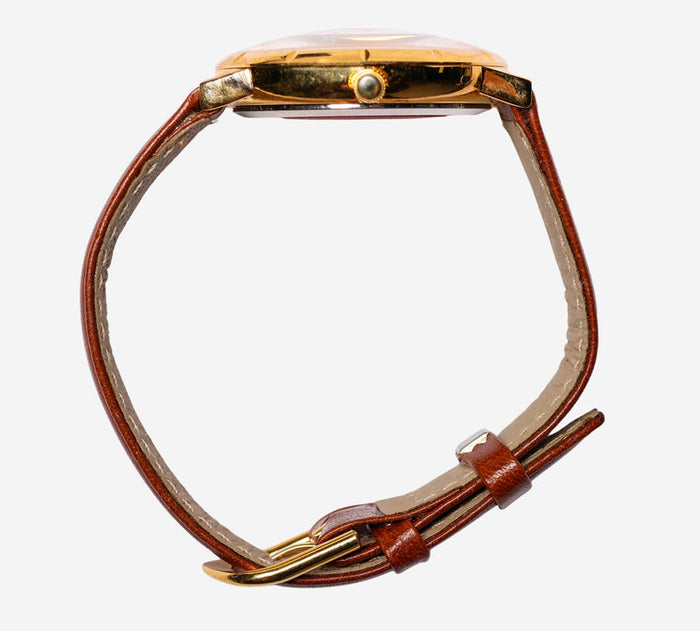 This pre-owned Disney watch is in Excellent condition featuring Quartz Analog movement, with a Gold case and a Brown Leather 7 inch band. Own a piece of watchmaking history and give this watch a second life. All watch movements and batteries have been tested and operate as intended. No battery included for D5quartz watches. We cannot guarantee water resistance ratings are intact.