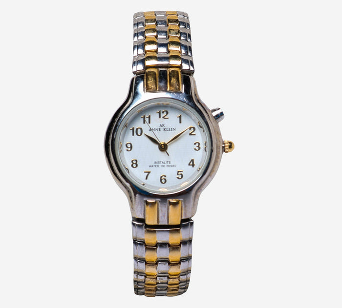 This pre-owned Anne Klein watch is in Good condition featuring Quartz Analog movement, with a Silver case and a Silver & Gold Metal 6.5 inch band. Own a piece of watchmaking history and give this watch a second life. All watch movements and batteries have been tested and operate as intended. No battery included for D5quartz watches. We cannot guarantee water resistance ratings are intact.