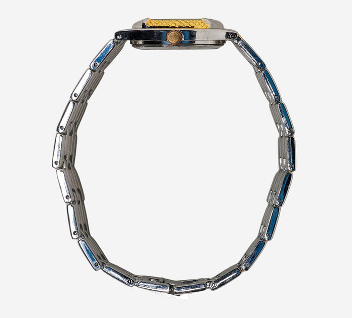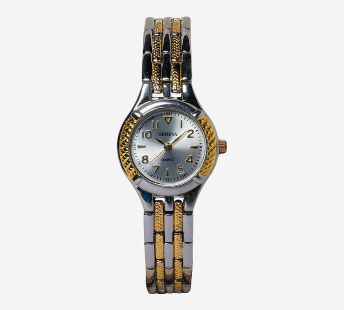 This pre-owned Geneva watch is in Excellent condition featuring Quartz Analog movement, with a Gold & Silver case and a Gold & Silver Metal 6 inch band. Own a piece of watchmaking history and give this watch a second life. All watch movements and batteries have been tested and operate as intended. No battery included for D5quartz watches. We cannot guarantee water resistance ratings are intact.