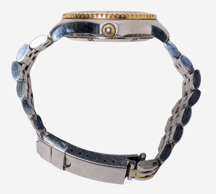 This pre-owned Wenger watch is in Good condition featuring Quartz Analog movement, with a Silver case and a Silver & Gold Metal 7 inch band. Own a piece of watchmaking history and give this watch a second life. All watch movements and batteries have been tested and operate as intended. No battery included for D5quartz watches. We cannot guarantee water resistance ratings are intact.