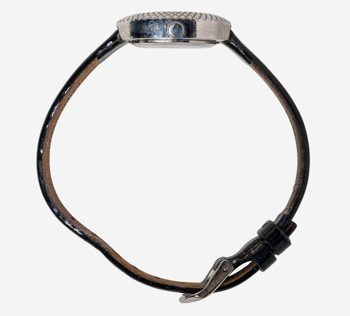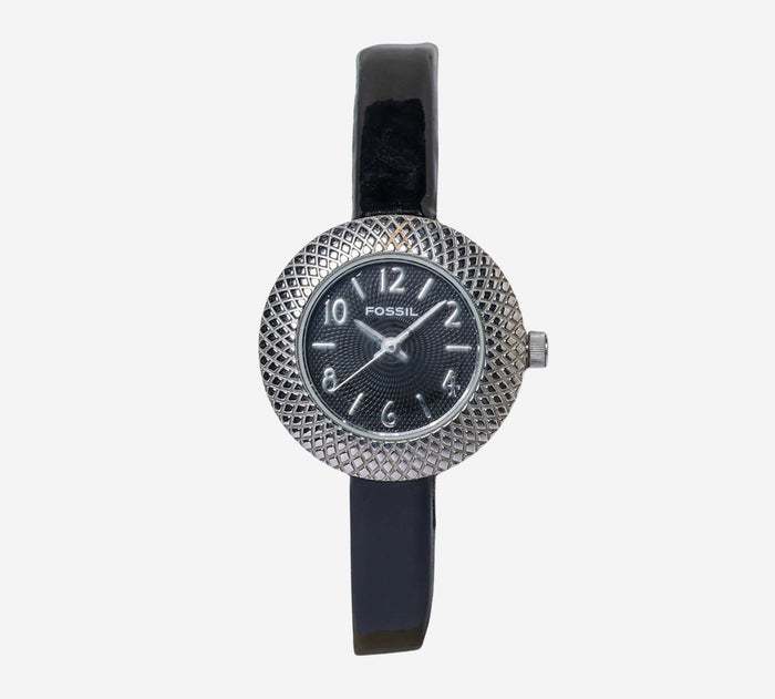This pre-owned Fossil watch is in Good condition featuring Quartz Analog movement, with a Silver case and a Black Leather 7 inch band. Own a piece of watchmaking history and give this watch a second life. All watch movements and batteries have been tested and operate as intended. No battery included for D5quartz watches. We cannot guarantee water resistance ratings are intact.