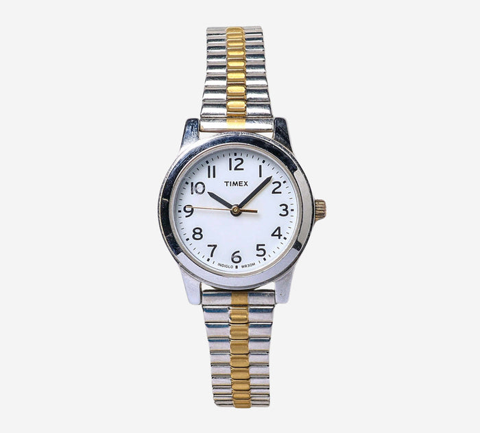 This pre-owned Timex watch is in Excellent condition featuring Quartz Analog movement, with a Silver case and a Silver & Gold Metal 7 inch band. Own a piece of watchmaking history and give this watch a second life. All watch movements and batteries have been tested and operate as intended. No battery included for D5quartz watches. We cannot guarantee water resistance ratings are intact.
