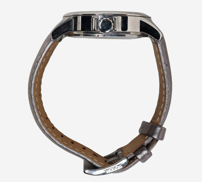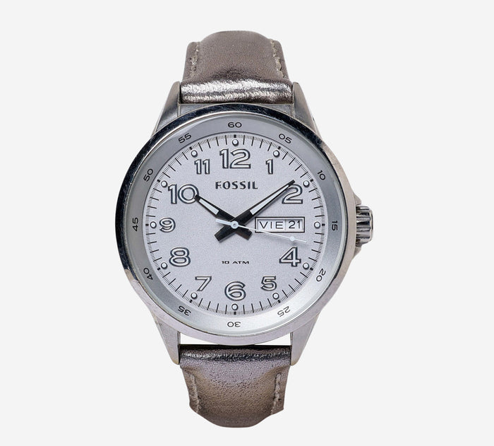 This pre-owned Fossil watch is in Excellent condition featuring Quartz Analog movement, with a Silver case and a Silver Leather 7 inch band. Own a piece of watchmaking history and give this watch a second life. All watch movements and batteries have been tested and operate as intended. No battery included for D5quartz watches. We cannot guarantee water resistance ratings are intact.