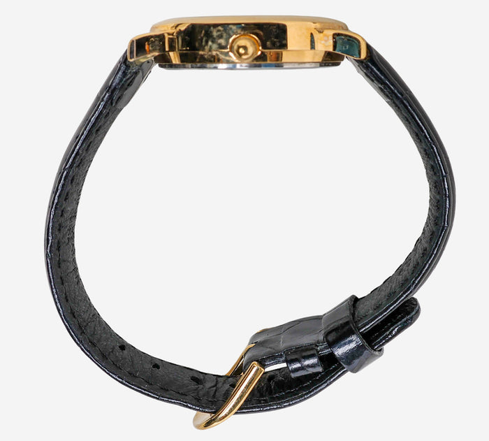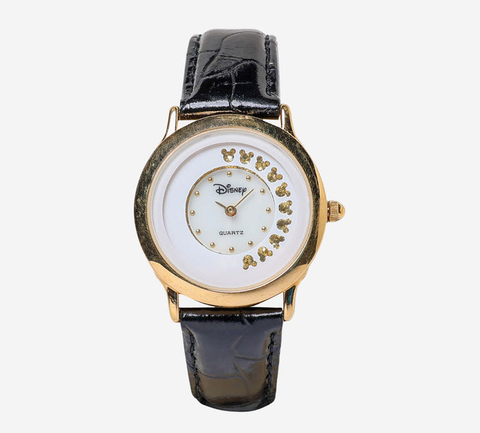 This pre-owned Disney watch is in Excellent condition featuring Quartz Analog movement, with a Gold case and a Black Leather 7 inch band. Own a piece of watchmaking history and give this watch a second life. All watch movements and batteries have been tested and operate as intended. No battery included for D5quartz watches. We cannot guarantee water resistance ratings are intact.