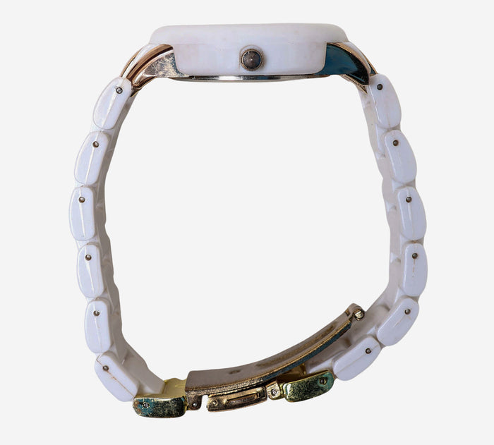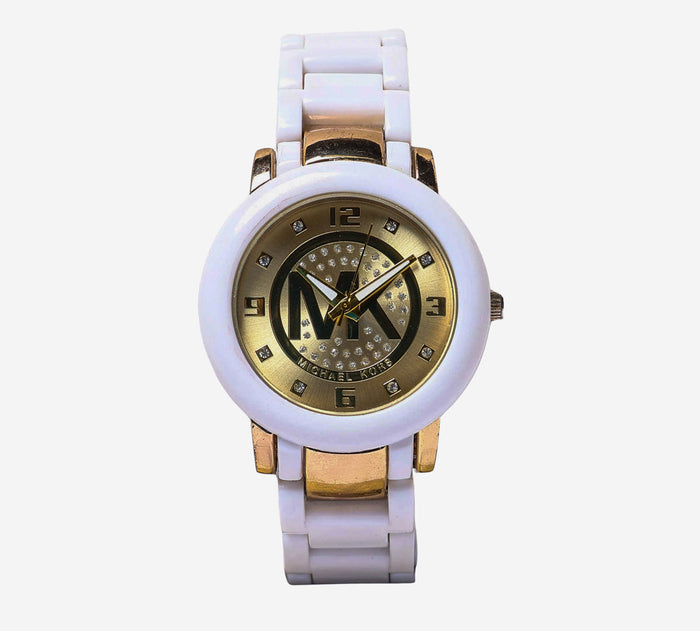 This pre-owned Michael Kors watch is in Excellent condition featuring Quartz Analog movement, with a White case and a White Plastic 7 inch band. Own a piece of watchmaking history and give this watch a second life. All watch movements and batteries have been tested and operate as intended. No battery included for D5quartz watches. We cannot guarantee water resistance ratings are intact.