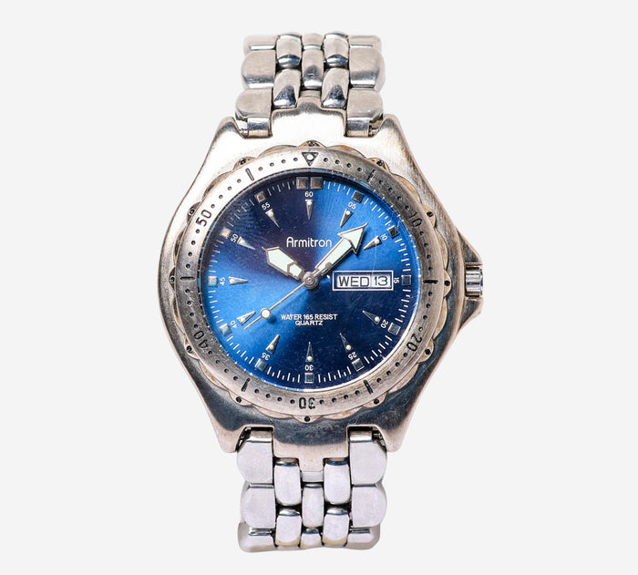 This pre-owned Armitron watch is in Good condition featuring Quartz Analog movement, with a Silver case and a Silver Metal 7 inch band. Own a piece of watchmaking history and give this watch a second life. All watch movements and batteries have been tested and operate as intended. No battery included for D5quartz watches. We cannot guarantee water resistance ratings are intact.