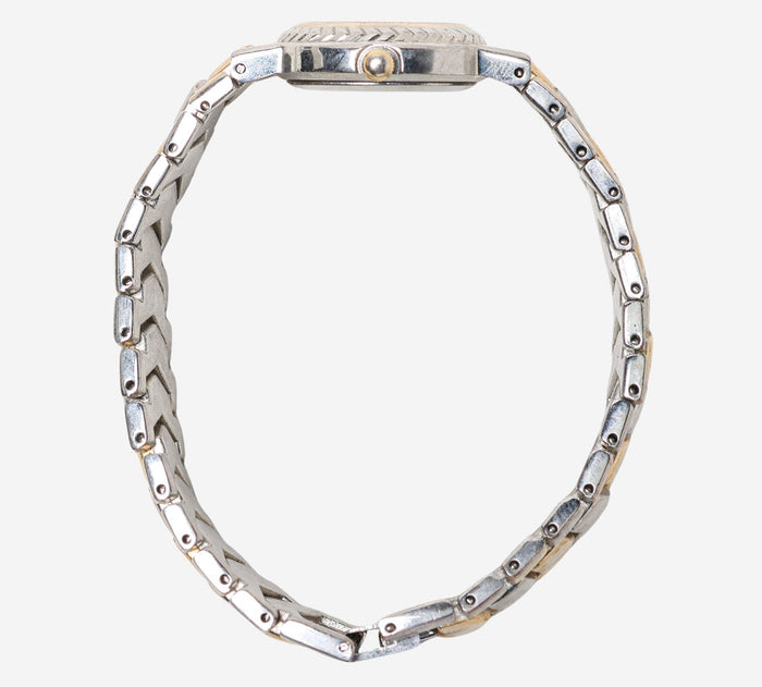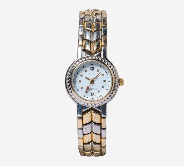 This pre-owned Geneva watch is in Excellent condition featuring Quartz Analog movement, with a Silver case and a Silver and Gold Metal 6 inch band. Own a piece of watchmaking history and give this watch a second life. All watch movements and batteries have been tested and operate as intended. No battery included for D5quartz watches. We cannot guarantee water resistance ratings are intact.