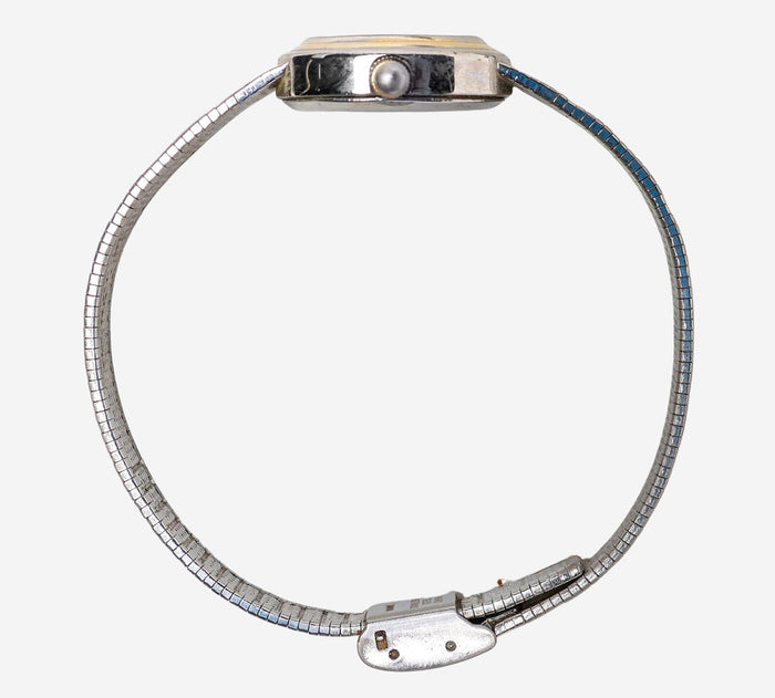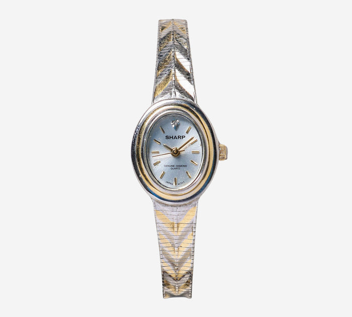 This pre-owned Sharp watch is in Good condition featuring Quartz Analog movement, with a Silver case and a Gold and Silver Metal 6 inch band. Own a piece of watchmaking history and give this watch a second life. All watch movements and batteries have been tested and operate as intended. No battery included for D5quartz watches. We cannot guarantee water resistance ratings are intact.