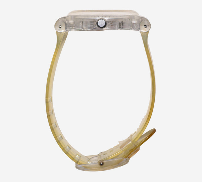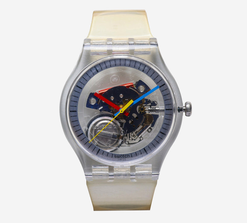 This pre-owned Swatch watch is in Good condition featuring Quartz Analog movement, with a Clear case and a Clear Resin 7.5 inch band. Own a piece of watchmaking history and give this watch a second life. All watch movements and batteries have been tested and operate as intended. No battery included for D5quartz watches. We cannot guarantee water resistance ratings are intact.