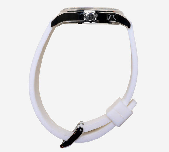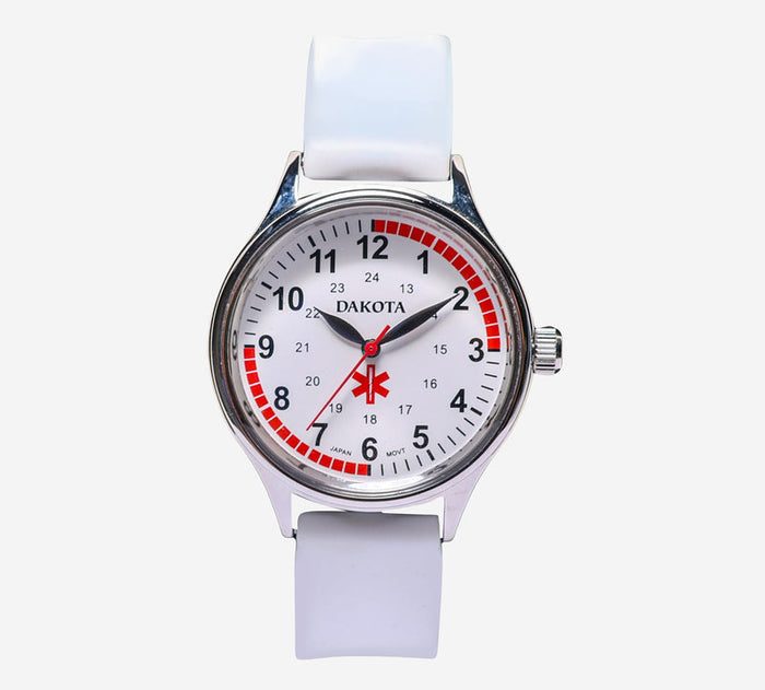 This pre-owned Dakota watch is in Excellent condition featuring Quartz Analog movement, with a Silver case and a White Resin 7 inch band. Own a piece of watchmaking history and give this watch a second life. All watch movements and batteries have been tested and operate as intended. No battery included for D5quartz watches. We cannot guarantee water resistance ratings are intact.