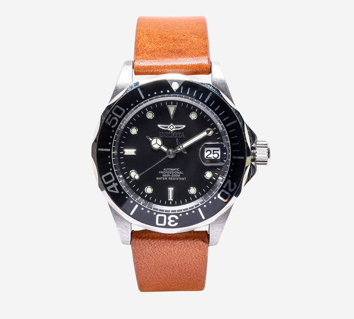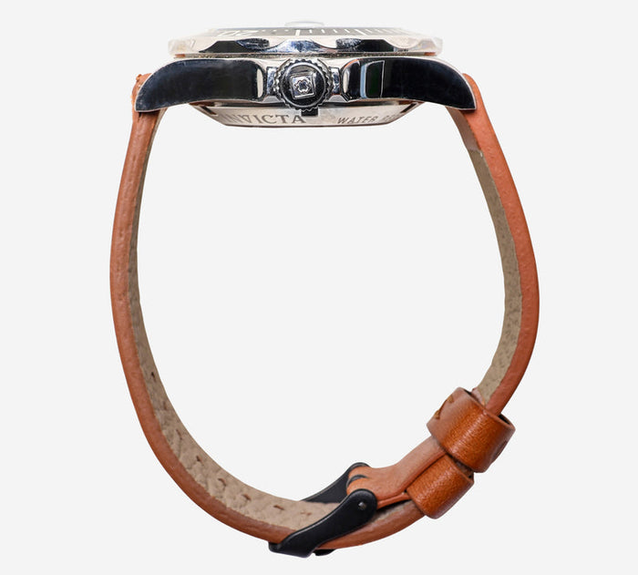 This pre-owned Invicta watch is in Excellent condition featuring Automatic movement, with a Black case and a Brown Leather 7 inch band. Own a piece of watchmaking history and give this watch a second life. All watch movements and batteries have been tested and operate as intended. No battery included for D5quartz watches. We cannot guarantee water resistance ratings are intact.