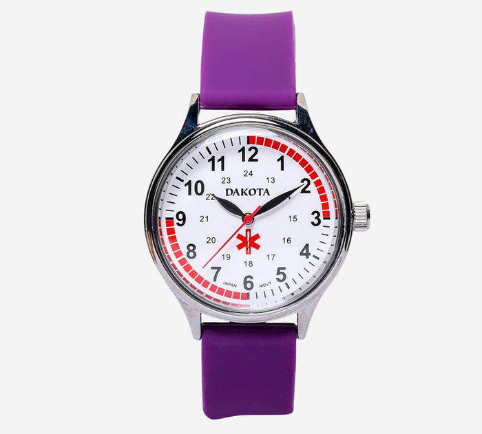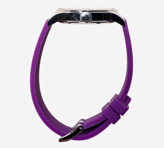 This pre-owned Dakota watch is in Excellent condition featuring Quartz Analog movement, with a Silver case and a Purple Resin 7 inch band. Own a piece of watchmaking history and give this watch a second life. All watch movements and batteries have been tested and operate as intended. No battery included for D5quartz watches. We cannot guarantee water resistance ratings are intact.