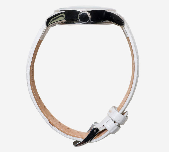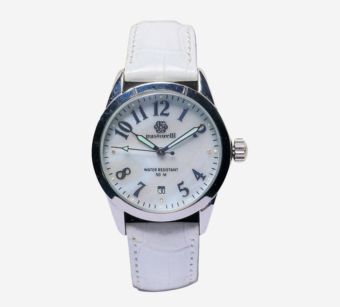 This pre-owned Pastorelli watch is in Excellent condition featuring Quartz Analog movement, with a Silver case and a White Leather 7 inch band. Own a piece of watchmaking history and give this watch a second life. All watch movements and batteries have been tested and operate as intended. No battery included for D5quartz watches. We cannot guarantee water resistance ratings are intact.