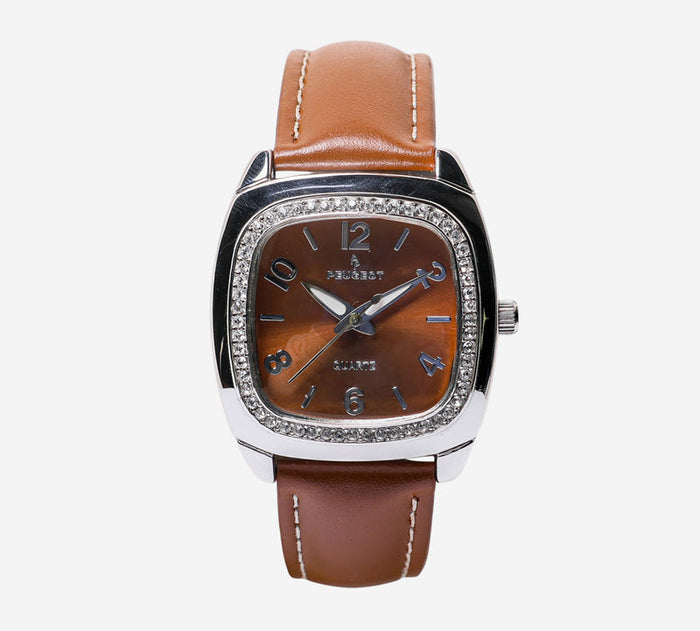 This pre-owned Peugeot watch is in Excellent condition featuring Quartz Analog movement, with a Silver case and a Brown Leather 7 inch band. Own a piece of watchmaking history and give this watch a second life. All watch movements and batteries have been tested and operate as intended. No battery included for D5quartz watches. We cannot guarantee water resistance ratings are intact.