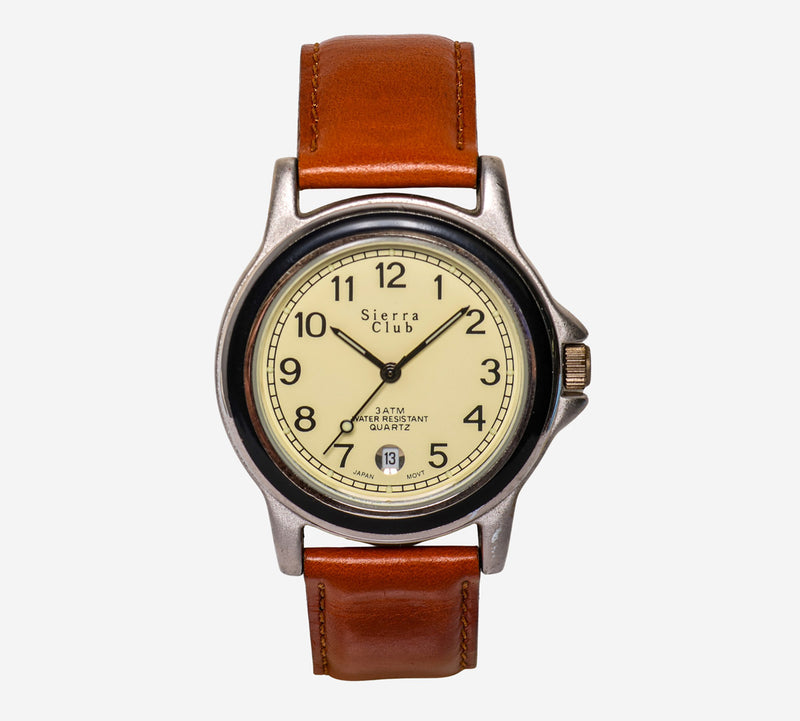 This pre-owned Sierra Club watch is in Good condition featuring Quartz Analog movement, with a Silver case and a Brown Leather 7 inch band.